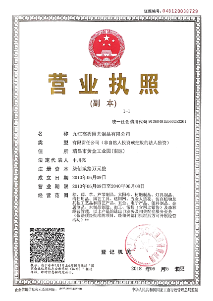 地址:中国江西省瑞昌市黄金工业园南园九江高秀园艺制品有限公司
